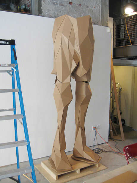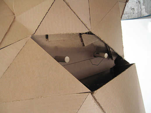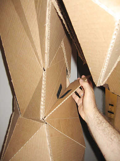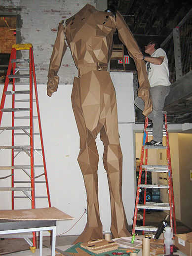 4) crear polígonos de los espacios como señalé anteriormente, reduciendo el número de polígono secciones del cuerpo aparte en la licuadora, esto creó algunas áreas faltantes donde las distintas partes se une uno al otro. Una vez que la cifra global es juntos, es necesario medir y cortar diferentes formas de polígono que estaban bien pegados o velcro en el lugar en la parte superior de las piernas, la parte superior de la zona de la cintura y en el cuello (hacer la zona del cuello antes de erigir la figura o tendrá un momento muy difícil de él!). Hice todas las formas de polígono para sujetar a las partes del cuerpo más baja siguiente para que todos se desintegraría y que van de la mano otra vez la próxima vez que visualizar el proyecto. También hice uno de los polígonos finales entre la cintura y el torso asegurado con velcro por lo que se podría quitar para tener acceso a las clavijas para el desmontaje al final de mi show de Eyebeam.