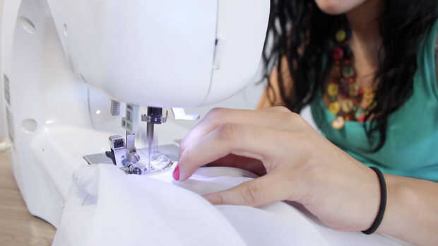 Hacer un montaje para luego añadir las telas al superior. Fijar el tul al top con alfileres y coserlos.