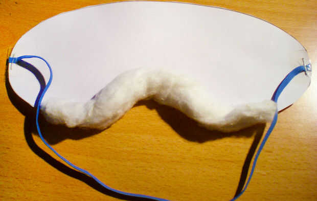 Pegamento algodón a lo largo de la línea de fondo gris. Esto produce un ajuste apretado debajo de los ojos y la nariz. Utilice pegamento de papel blanco.