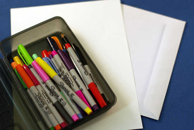 --colorear instrumentos; Utiliza sharpies, pero cualquier cosa va a hacer, como crayones, lápices de colores y marcadores regulares. Tenga cuidado de comprobar si sus elegidos colores sangrarán a través de la cartulina; Si es así, simplemente añada una capa de desecho mientras que es para colorear, entre el frente e interior de la tarjeta.