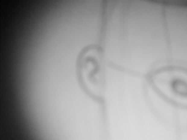 Poner un signo de interrogación con ningún punto interior. Voltear y repetir para el oído derecho (por ejemplo: ver foto). (Nota: los paréntesis representan las orejas y se referirá así de ahora en adelante.)