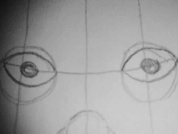 Paso 8: * Dibuja dos figuras de fútbol americano dentro de cada ojo. Deben estirar horizontalmente a través de los ojos, tener ambas puntas terminando en la línea de la cuadrícula horizontal. Debe ser centro en el mismo punto de la cuadrícula como los ojos y pupilas. También debe ser tan amplia como la pupila, verticalmente. (por ejemplo: ver foto) (Nota: estos balones de fútbol americano representan las tapas del ojo y se referirá así de ahora en adelante.)