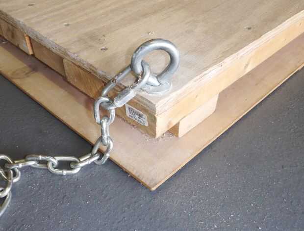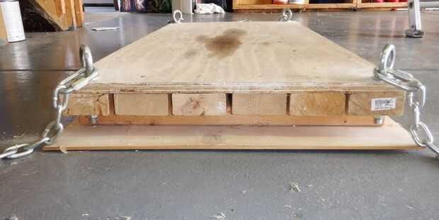 Había varias opciones en la plataforma considera, pero fue con una simple serie de cadenas para hacer la conexión para el cable de elevación. Este consiste de una serie de 2x4s cubierto con un pedazo de madera contrachapada de ¾". Los tres miembros de la cruzados en la parte inferior dar cabida a las armellas sujetar y llevar la parte superior del nivel de la plataforma a la parte inferior de la vigueta del piso en el ático. La piel de madera contrachapada de ¼" también se une a ellos y proporciona un buen sellado para evitar errores, así como un borde acabado agradable al mirar la plataforma desde abajo cuando está en su posición de estiba.