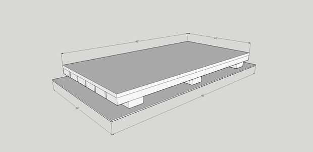 La plataforma es de 45 "x 22" para permitir para que quepa en la abertura con una pequeña habitación de sobra. Comience cortando la madera de ¾" a este tamaño entonces 6 cada de 2x4s a 45" de largo. Tornillo uno de 2x4s a cada borde largo de la madera contrachapada entonces uniformemente espacio entre los restantes cuatro 2x4s. No repuesto de los tornillos en este paso.