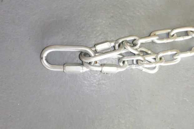 Con la plataforma sentado pernos de ojo para arriba, una cadena de atado a cada perno con un 3/8 quick-link, luego tomar las dos cadenas en cada extremo de la plataforma y conectar un enlace rápido 3/8" a los extremos de estos, finalmente conectar esos enlaces con enlace rápido de 7/16" y clip de esos dos enlaces sobre el gancho. Sé que parece un montón de enlaces pero era necesario debido a la brecha en el eslabón de cadena y el grosor del gancho.
