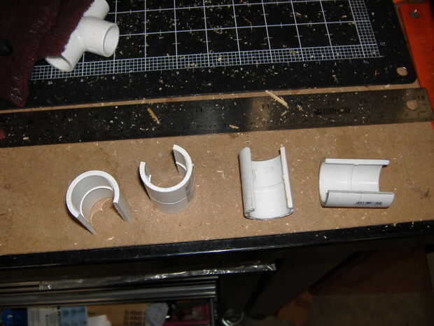 Los tubos de lado y preparar los acopladores del tubo de 3/4. Se utilizan como abrazaderas para mantener las puertas de la cabina de la pintura. Las puertas de ser una lona. Los acopladores tienen una astilla cortada fuera de ellos que permite resbale sobre la lona y la 1/2 pvc. Esto atrapa el pvc entre los 1/4 y tiene no se le despegan.