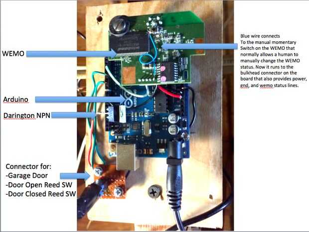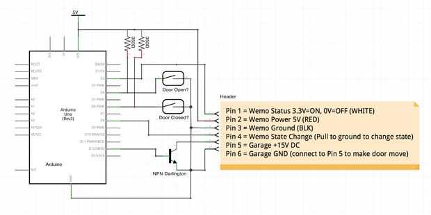 - Conecte el colector de los Darlington NPN a un cable que se conecta a uno de los dos terminales de su disparador de motor de puerta de garaje. Conecte la otra puerta de garaje terminal a tierra en la placa Arduino.