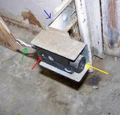 La flecha roja señala el LED. Cada sensor tiene un LED. Debe ser brillante y muestran un color sólido. Algunos son verdes y algunos son de color rojos, dependiendo del fabricante de su unidad de abridor. Un sensor en nuestra unidad mostró un brillante LED constante. El otro, este, era débil y agitó rápidamente. Que, junto con la luz intermitente del techo y la necesidad de sostener el botón del interruptor, son señales que algo no está bien.