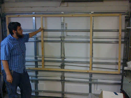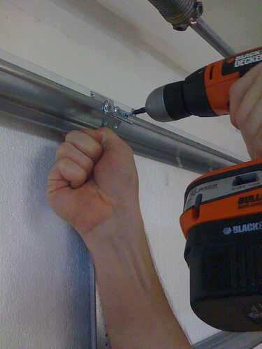 Una vez que tengas todas las bisagras montadas, abra la puerta del garaje para que las bisagras están ahora abiertos y acentuado en la tierra. Conseguir a alguien para ayudarle a obtener el marco todos alineado. Una vez que lo alinearon, levantar en su lugar y haz cada bisagra atornillada al marco.