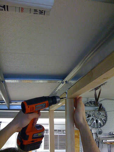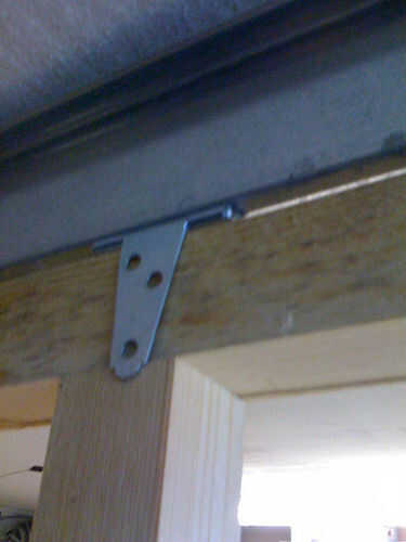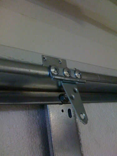 Cada bisagra debe alinearse con los rayos verticales del marco, así que asegúrese de que las mides mejor manera posible. Ponemos 3 tornillos a través de cada bisagra en el marco de la puerta de garaje. Esta cosa va a ser bastante pesado, y no quiere caerse.
