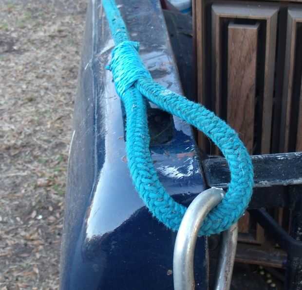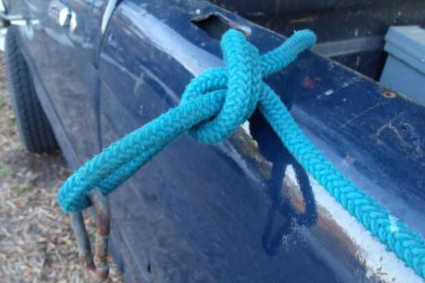 Para la facilidad de asegurar cargas de diverso tamaño pongo lazos en una de las cuerdas de atado, es un lazo hacia el frente de la camioneta y el otro es más de un ojo en el extremo de la cuerda. Los aros de clip en las fotos vienen en prácticos para las líneas adicionales o cuerdas del amortiguador auxiliar