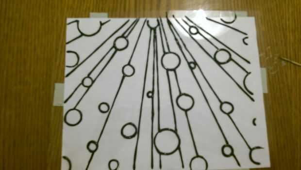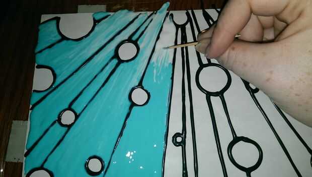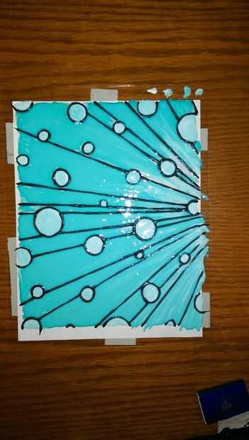 Usa el líquido para delinear su diseño. Me pareció la mejor manera obtener el plomo iniciado y luego manténgalo sobre un 1/4" por encima de la superficie para que vino hacia fuera uniformemente. Si nunca ha utilizado pinturas de la Galería cristal recomiendo jugar un poco antes de comenzar el tanque real para tener una idea de lo que funciona mejor para usted.