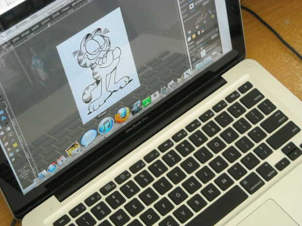 Garfield con una mirada petulante fue una gran elección de Google imágenes.  Tamaño de la imagen para ajustarla a tu taza.  Un poco de medición está involucrado.
