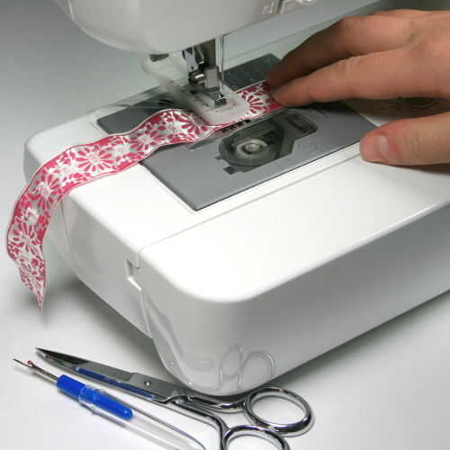 Ejecutar una prueba en un trozo de cinta y ajuste para la tensión, de punto de anchura, etc.. Si no está seguro de cómo coser un ojal en su máquina, consulte el manual y seguir los pasos con precisión.