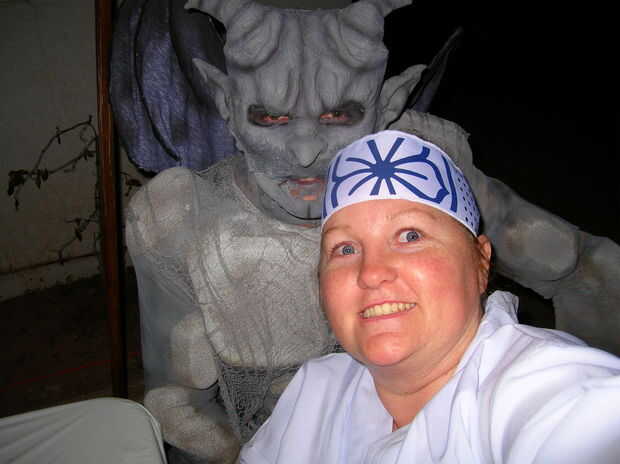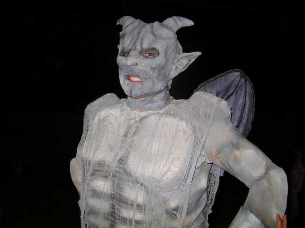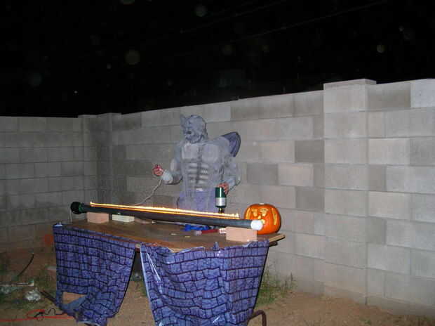 esto es bastante bajo tecnología hemos hecho mi pareja en un cementerio para Halloween. Hemos encontrado una docena decoraciones de piedra sepulcral de espuma en una tienda de dólar y había atornillado a un traje verde. Algunos murciélagos en alambre