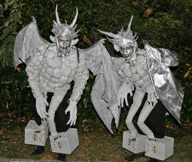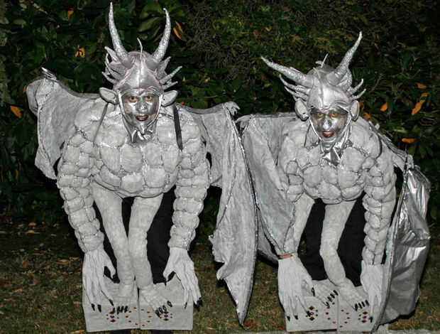Estos trajes eran totalmente hecho a mano, y participan piezas de costura de ella, un montón de pegado, pintura y alguna adaptación de una variedad de artículos comprados en tiendas. Los trajes incluyen una ilusión, en el que parece que tenemos piernas perching en los pedestales, mientras nuestras piernas reales de mezcla en el fondo.