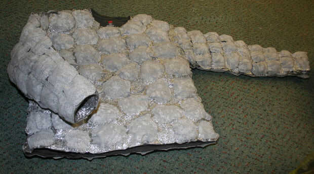 Hicimos las camisas como el cuerpo de la gárgola cubierto con piedras. Primero hemos pintado una gran cantidad de fieltro con la pintura de piedra gris. Entonces nos corte el fieltro en cuadrados, con bordes redondeados. Cada plaza fue alrededor de 4,5 pulgadas por 5 pulgadas. Luego tomó una pequeña cantidad de relleno, lo suficiente como para caber dentro de la forma mientras que todavía pudiendo llegar a los bordes pegados y había pegado a los bordes de la forma sobre el relleno en la camiseta. Esto formó una forma de piedra en la camisa. Luego cubrimos completamente ambos lados de las camisetas con estas formas. Cuando que era seco, utilizamos pegamento glitter Plata para detallar todas las formas y llenar cualquier vacíos puntos, algo así como mortero entre las piedras.