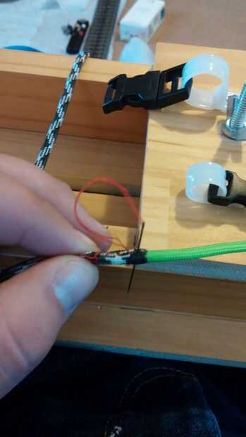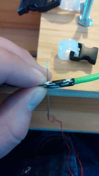 Con su aguja de rosca, puntada la sección pulgadas de cable que adjunta. Después de que primero empuje la aguja a través del cable, pasar la aguja a través de 2 hilos entre el nudo y la cuerda. Hacer tantos puntos como usted es cómodo con. Ate los extremos cuando se hace. Yo también quemar el hilo extra.