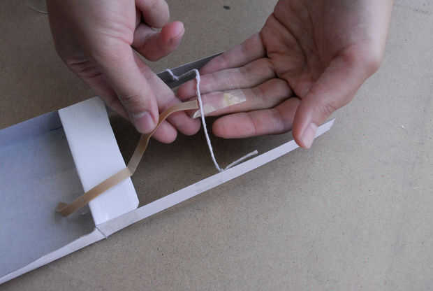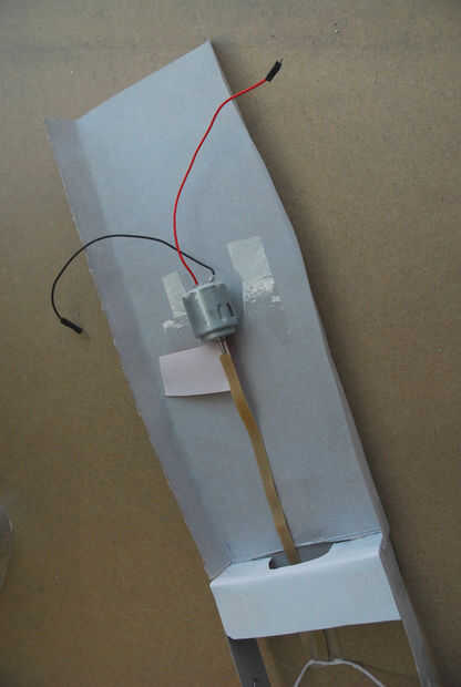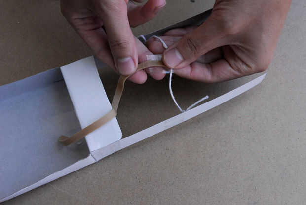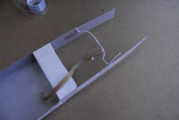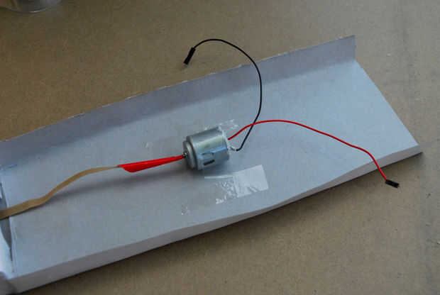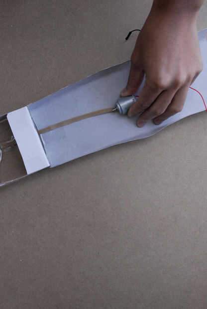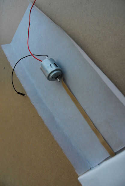 Cinta adhesiva (o tratar de atar) uno de los extremos de la banda de goma en el medio de la cadena. Alimentación de la cinta de goma a través del túnel. Coloque el motor para que el eje está alineado con el extremo de la goma elástica y cinta el motor hasta el brazo. 3 piezas de cinta; 1 uno en el motor y 2 piezas a cada lado del motor para mantener segura la primera cinta. Utilice cinta adhesiva u otro equivalente pegajoso, fuerte a la cinta el eje del motor a la banda de goma. Sin duda en busca de mejores formas de conectar la goma elástica al eje si tienes alguna sugerencia.