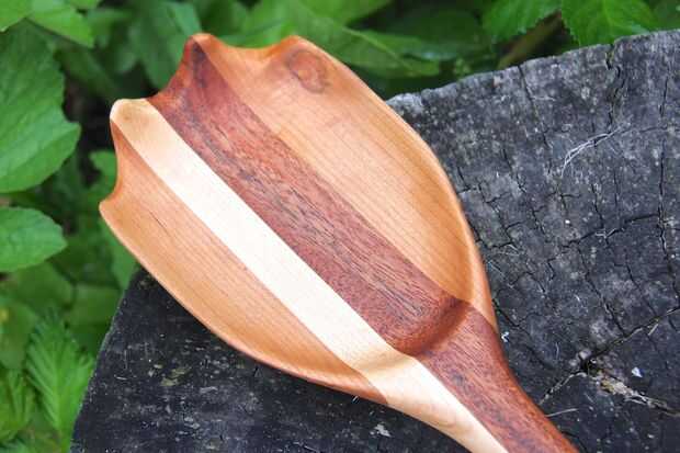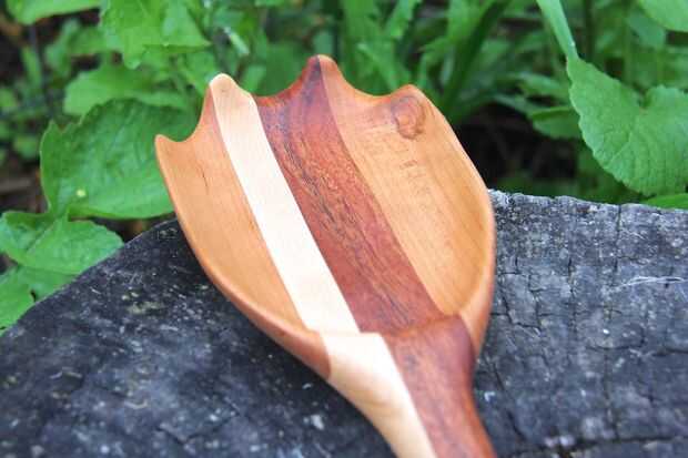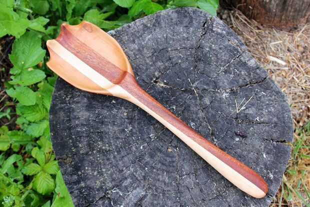 La cuchara en la foto a continuación se hace de (izquierda a derecha) cereza, arce, nogal, cerezo. Tiene un mango de tamaño considerable y una amplia cabeza sacar grandes cantidades de la mencionada ensalada deliciosa.