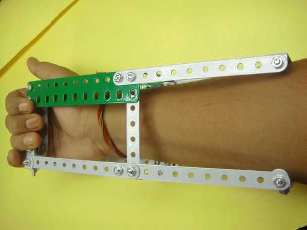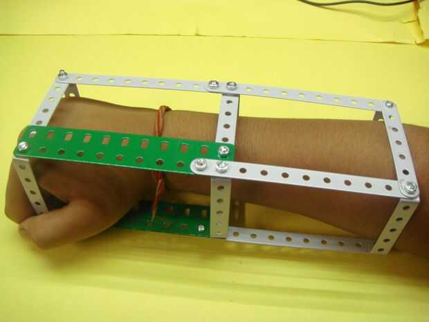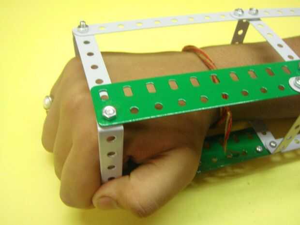 Estaríamos cometiendo un guante como estructura para nuestra garra robótica porque la garra no puede sujetarse a mano como esta sólo. Ahora la pregunta es cómo hacer un guante para su garra. La respuesta es muy simple. Estoy usando un kit de 'mechanix' para hacer el guante. Este kit compuesto por tiras y varillas de aluminio. Podemos hacer muchas cosas usando este kit. Pueden colocarse dos tiras junto con la tuerca y el perno. Hay agujeros en cada franja en la que se pueden colocar las tuercas. Creo que en América se le llama 'Mecano' pero en mi país lo llamamos 'mechanix'. Si no tienes un kit de mechanix entonces puedes utilizan un 3D para hacer el guante. Mediante una impresora 3D sería una mejor opción porque usted puede diseñar su guante según usted. También puede agregar más detalles a él. También puede hacer su guante con hojas de acrílico o madera si eres bueno en la elaboración de madera. Os adjunto dos tiras de pequeña mecánica por lo que me puedo sostener ese guante con esas tiras, y mientras que lo usa no sale de mi mano. Por favor haga una estructura fuerte para que no se rompe debido a cualquier descarga.