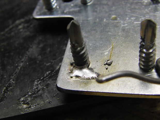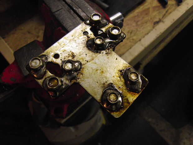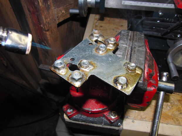 a pesar de los pernos sostener firmemente en la placa de T, para evitar el desenroscado, decido utilizar soplete pequeño y alambre de zinc simple para fijar cabezas... después limpié - esto lavar con gasolina.