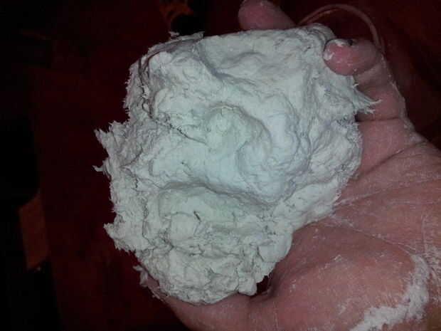 Afortunadamente, no he tenido problemas para esto mezcla a mano. Acaba de obtener un puñado y lo exprimir y exprimir hasta que esté bien mezclado. Si todavía ves harina seca o pedacitos de bultos, seguir mezclando. También puede Agregar un poco de agua si se siente seco. Mis junturas se secó parcialmente hacia fuera así que tuve que hacer este yo.
