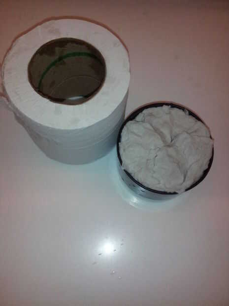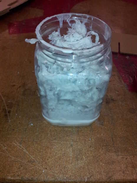 Tomar el papel higiénico barato y sumergirlo en un recipiente de agua caliente y exprímala para quitar cualquier exceso. El papel debe estar saturado, pero no goteando. Empujar en una taza de medir como en la foto. Desea un total de 1 1/4 tazas de papel higiénico húmedo, comprimido.