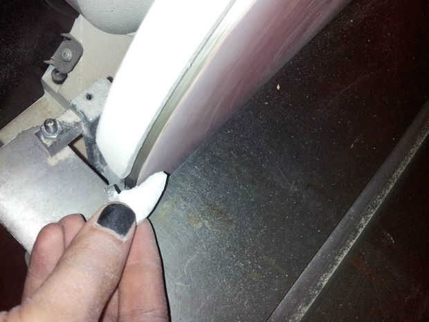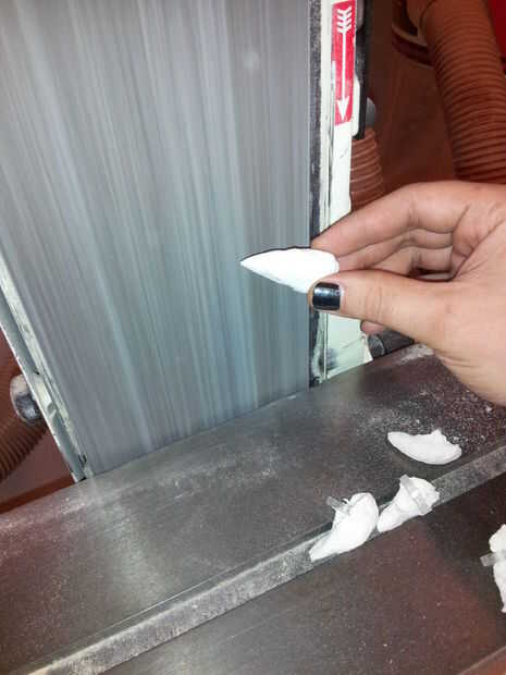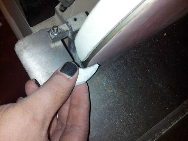 Una vez que estén seco, tomar a cualquiera que sea lijado herramientas que tenemos disponibles. Tuve suerte que mi formación básica con una lijadora de banda y disco en TechShop. He formado a este tipo de cosas usando una lijadora orbital o palm, pero la lijadora de correa/disco es definitivamente mejor. Encontré que podría conseguir un buen ángulo en la lijadora de disco alcanzando mis garras en el borde como se muestra en la foto. Me fui hacia adelante y hacia atrás entre estas dos hasta que fui feliz.