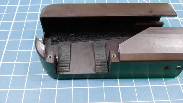 3. Corte un par 1/2" tiras largas de la espuma pegajosa respaldado y adherir en la parte inferior de la caja posterior entre estas dos agujeros. Esto evitará que el servo del deslizamiento en el plástico suave cuando se aplica un esfuerzo de torsión. Nota: usted puede hacer lo mismo para el bar de servo