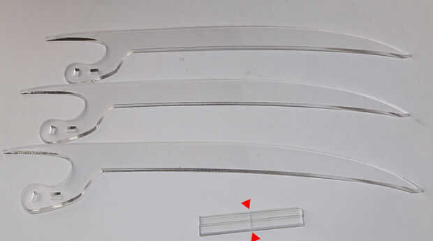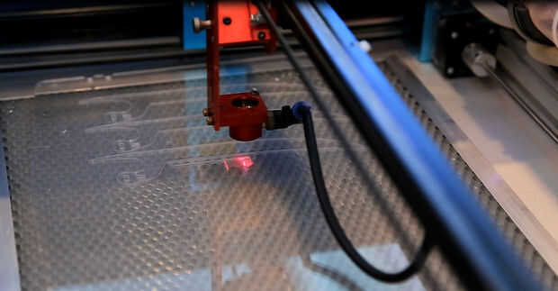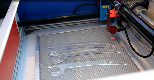 Cortar los archivos con un cortador láser. Grabar las líneas azules y corte en las líneas rojas.