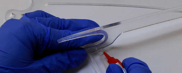 Encolar el soporte del centro a lo largo de la línea de grabado. Agregue el pegamento a los cuatro lados de la abrazadera y la garra en la línea de centro. Mantener en su lugar hasta que sea seguro. Hacer lo mismo con la segunda barra.