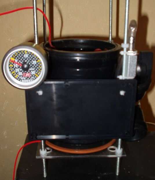 (Fig. 20) es la cámara de producción de hidrógeno completada con seguridad analógica manómetro conectado. Este manómetro adicional es necesario a: verificar la presión de la entrada digital y b: actúan como una copia de seguridad si el microcontrolador falla o se cuelga. También se muestra a la derecha de la cámara de la válvula de escape se utiliza para controlar el flujo de la salida hidrógeno y oxígeno.