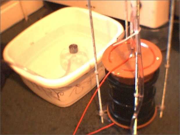Con la cámara de producción parcialmente terminada era hora de probar la salida de los electrodos. La cámara fue sellada parcialmente para contener el gas hidrógeno y el oxígeno producido y luego llena con agua del grifo para la reacción química ocurrir. Potencial de una batería de plomo pequeña 12 voltios entonces fue aplicada entre el ánodo y el cátodo de los electrodos. Gas de salida de la cámara de hilo en un recipiente de agua y permitió a burbujear en un recipiente sumergido boca abajo (ver Fig. 19). Se inició entonces un cronómetro para medir cuánto tiempo tardaron los electrodos para producir 250ml de la mezcla de hidrógeno y oxígeno. Después de sólo 11 minutos de producir gas 250ml nivel fue alcanzado y los electrodos entonces fueron desactivados. El hidrógeno y el oxígeno entonces fue probado por su pureza por levantando el recipiente fuera del agua al mismo tiempo como insertando una tablilla encendida el gas. (ADVERTENCIA... No aconsejo que hacerlo a menos que sepa lo que tu hacer!!!!!!). Un 'pop' más fuerte vino de la mezcla como combustión demostrando que en efecto era hidrógeno y el oxígeno presente en un substancial suficiente nivel para proporcionar energía a un dispositivo. La cámara bubbler no era necesario para esta prueba como en la actualidad no hay hidrógeno o el oxígeno está siendo celebrada y permitido para construir en cualquier lugar a cualquier presión peligrosa (explosivo!!!).