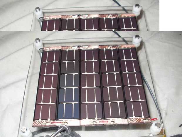 Para construir el panel solar, celdas solares de hueso desnudo flexibles se obtuvieron de cps-solar.co.uk y luego pegados a una hoja de metacrilato cuadrada con postes metálicos y tuercas en las esquinas para hacer las piernas ajustables (véase Fig. 21). Las patas ajustables permitir que el panel quede colocada en dirección a la luz solar desde cualquier ubicación. Cada panel se conecta en serie para proveer voltaje máximo posible y un bajo nivel de ruido estándar y cable de phono de baja atenuación fue unido. En la luz del sol con tensión de conexión de circuito abierto a través de las células fue hasta 20V. Prueba con la tensión conectada a través de una carga de 1K que Ohm permite que la energía de la célula solar calcular.