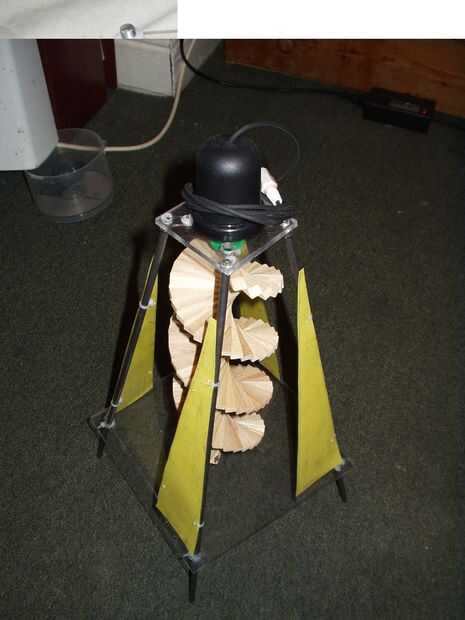 El generador eólico se hizo montando un motor en una pequeña plaza de plexiglás con el eje mirando a través del plexiglás. Un hilandero del viento fue de Ebay.co.uk y unido al eje del motor por medio de un aburrido a engranaje. Una segunda plaza más grande de plexiglás fue utilizada para la parte inferior de la ruleta para descansar, permitiendo que el motor gire con menos fricción, el peso de la ruleta ya no descansa sobre los motores cepillados. Las piernas fueron corte de tubería de acero y pegadas en su lugar para apoyar a la ruleta en un viento fuerte (véase Fig. 22). Se encontró entonces que el hilandero podría girar ambas maneras en el viento que significa que el motor sea se carga
