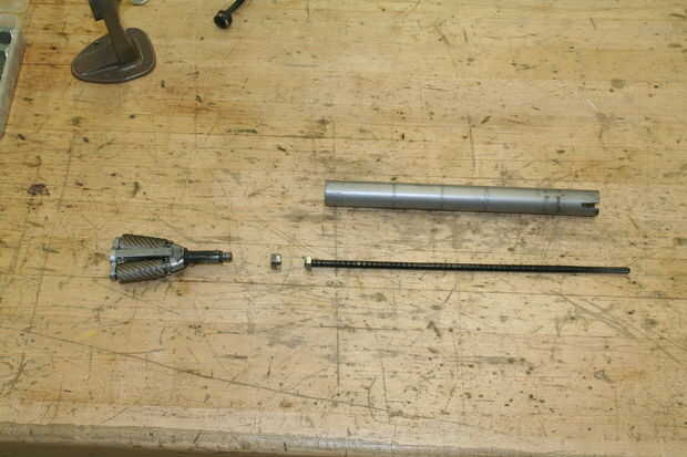 Vuelva a colocar la pieza cortada del eje en la carcasa del motor. Tomar la varilla larga fina y resbálelo a través el busing plástico hasta que asientos en el interior del motor-Asegúrese de que está sentado! El extremo de esta varilla es cuadrado, giro la barra un poco para asegurarse de que va en el agujero cuadrado dentro del motor.