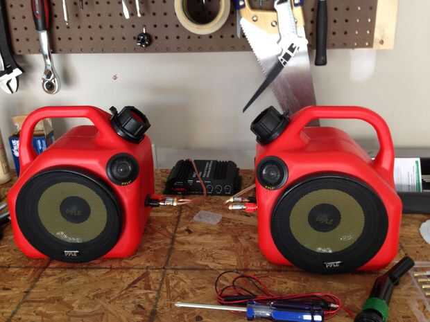 Algunos oradores de garaje nuevo con latas de gas de plástico y un kit de altavoces de 2 vías. Estándar 5L 1,25 gal gas latas Fit kit de woofer/tweeter de 2 vías 6.5" perfectamente. Como un bono adicional, el pico sirve para liberar la presión en la lata del altavoz. Usted puede conseguir todo lo necesario para ~ $69 de Amazon o Home Depot.