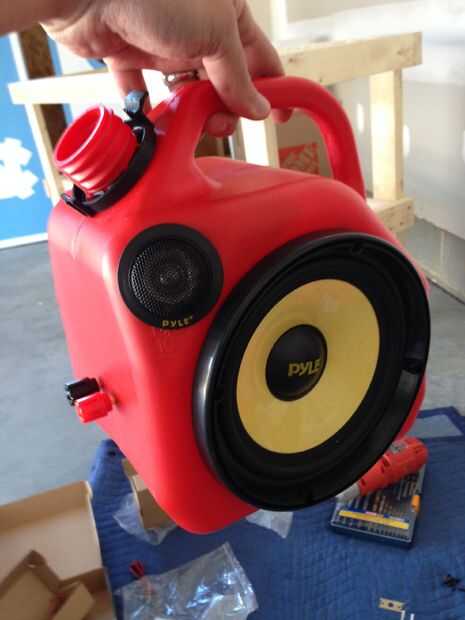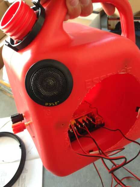 Por último, nos todos el cable flojo/extra cram en el poder y montar el altavoz para bajas audiofrecuencias. Para los agujeros de fijación del altavoz para bajas audiofrecuencias, coloque el altavoz y el borde negro donde quieren, luego meter un punzón o broca a través de los agujeros para marcar en la lata. Puede perforar hacia fuera si te gusta pero encontré que pude apenas entornille a mano el altavoz en sin agujeros. Plástico de la lata es robusto suficiente que no necesita nada para los tornillos, pero puedes probar con los sujetadores metálicos que vienen en el kit de Pyle si usted se siente tan inclinado.