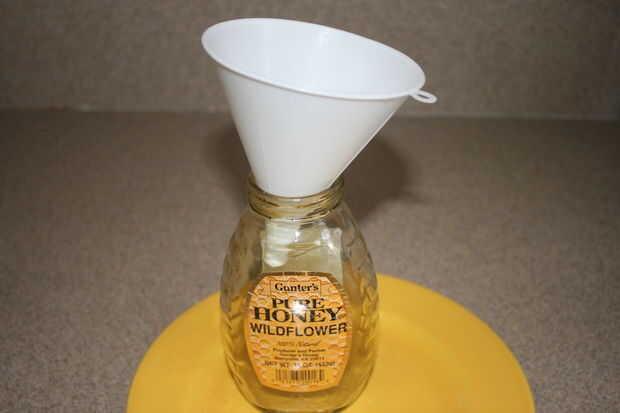 ¿Qué mejor para almacenar mi jarabe de miel en que vino la botella de la miel? Un embudo debería ser fácil de llenar la botella. ¿Fácil como la empanada, la derecha?