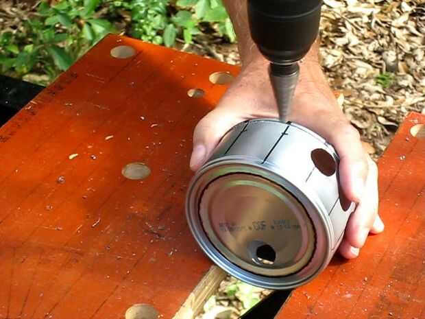 2. Taladros de doce ¾" diámetro ½" debajo de la parte superior, espaciada uniformemente alrededor de la lata.