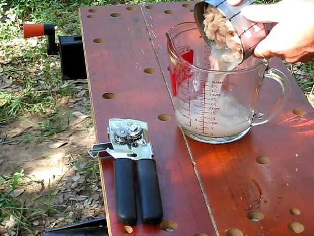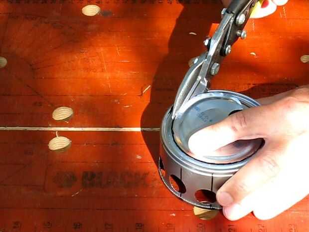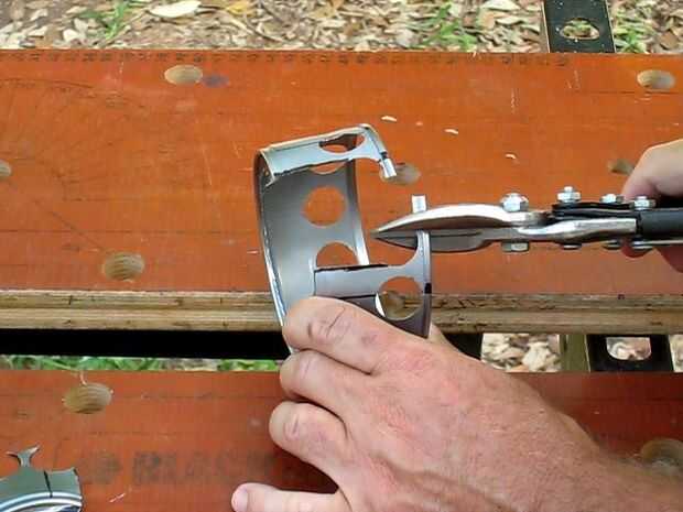 4. Entre dos de los agujeros, cortar el metal, dejando el borde superior. Este es el puerto de combustible. También, corte ½" de la llanta sobre el puerto de combustible, que permite el soporte del pote para exprimir un poco.
