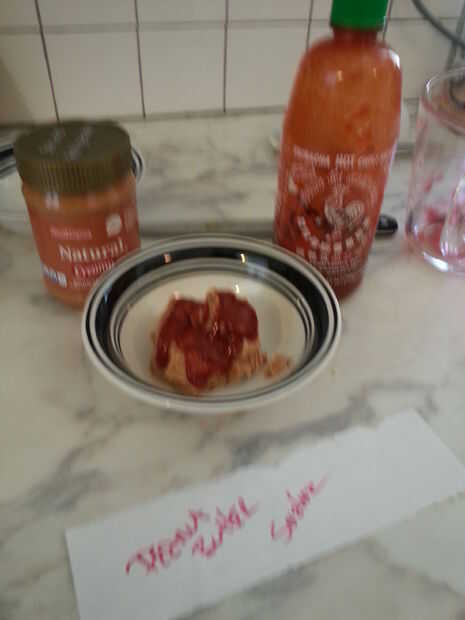 Manteca de cacahuete y Sriracha. Esta imagen no resulta muy bien, pero sólo sobre una taza de manteca de cacahuete y un buen chorro grande de gallo-salsa.