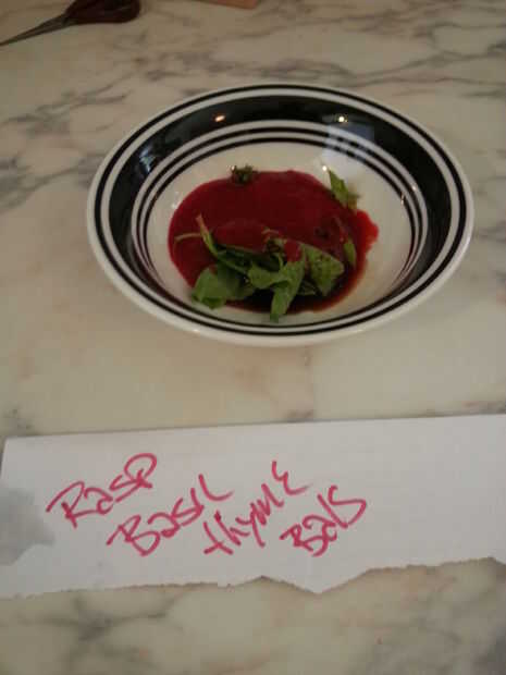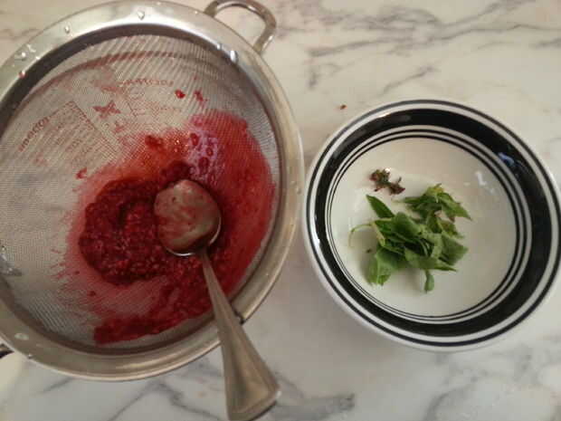 Mi primer sabor fue frambuesa/tomillo/albahaca/balsámicas. Yo cultivo mis propias hierbas en el patio trasero para que un viaje rápido hacia fuera detrás me pescó algunos de albahaca y tomillo. Poner las frambuesas a través de una pantalla para mantener las semillas hacia fuera y lanzó el resto en un recipiente. Tengo un procesador de alimentos para no tener que preocuparse por cosas de la corte aquí.