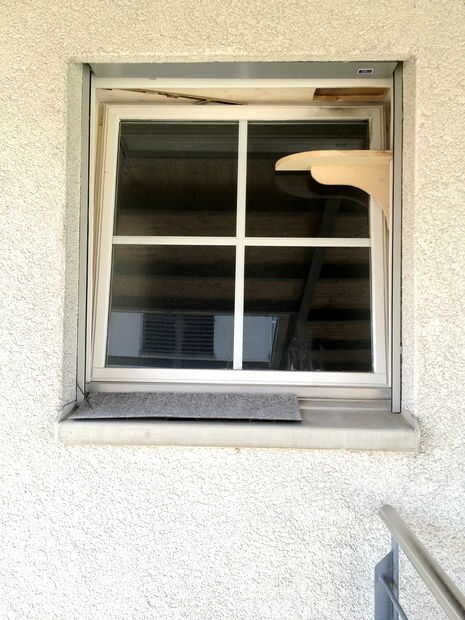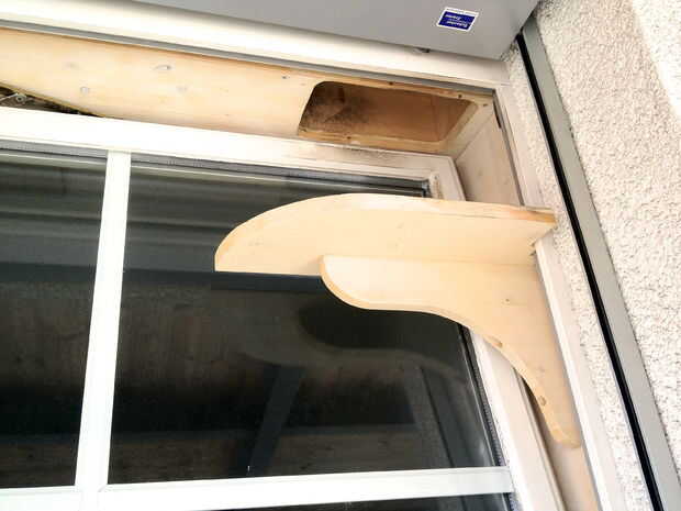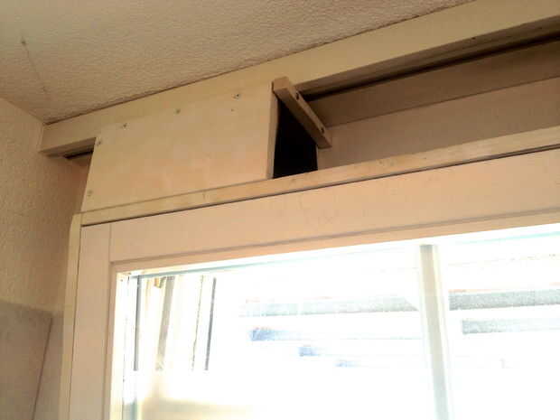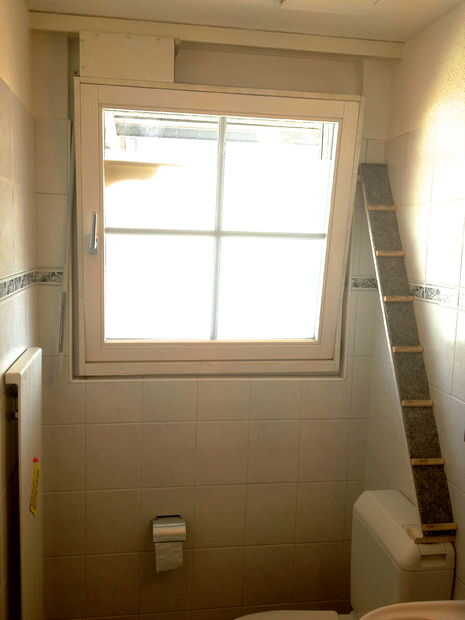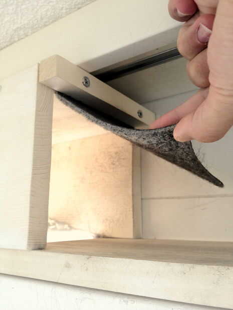 La construcción de madera cubre todos los lados de la (ahora siempre) Abra la ventana del pivote-colgado sin destruir la ventana sí mismo. Si algún día cambiamos el piso, simplemente podemos quitar la tapa y la ventana será como era antes. La aleta de alfombra asegura que no es mucho calor se pierde durante el invierno y no demasiados bichos entran en el piso durante el verano.
