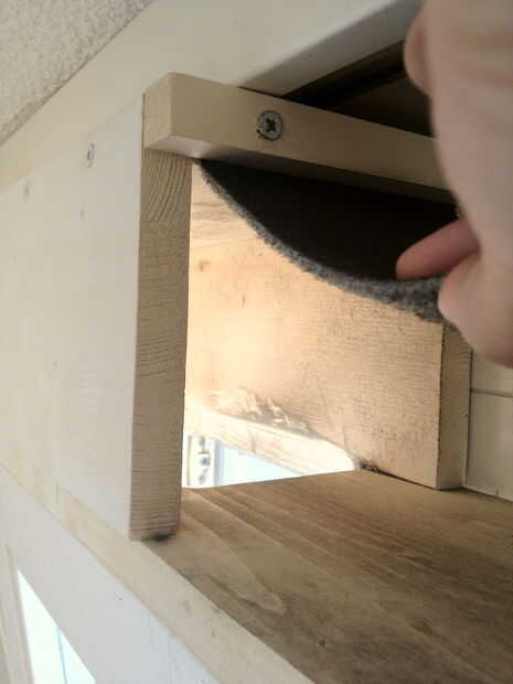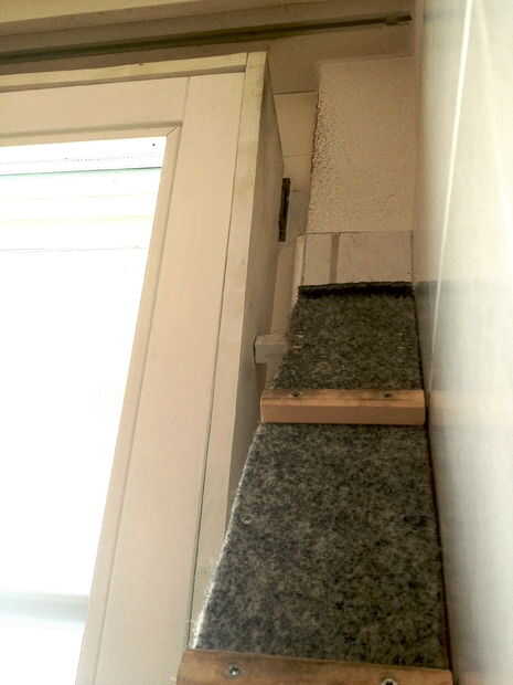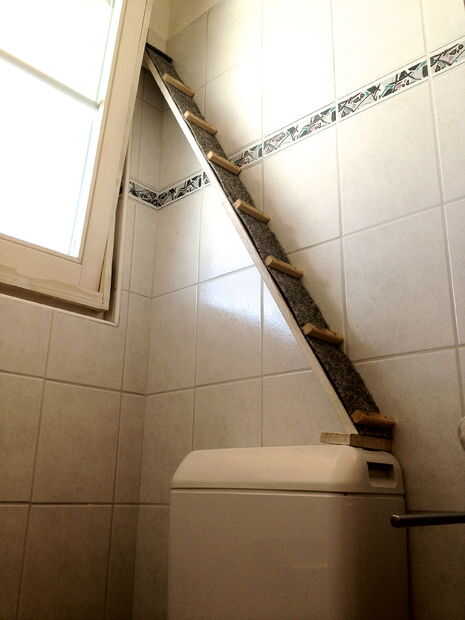 Sin embargo, tenemos un baño con un pivote-colgada de la ventana que conduce a las escaleras. Así que construimos una configuración donde el gato salta sobre una pequeña escalera que conduce a la parte superior del marco de ventana. En la parte superior la ventana de marco es una caja con una aleta de alfombra. El gato puede empujar el colgajo abierto y el paso a través del agujero en una plataforma pequeña en el otro lado de la ventana. Desde allí es sólo un pequeño salto al suelo. El camino de regreso en funciones similares, sólo en la dirección opuesta.