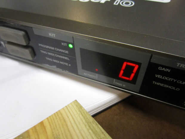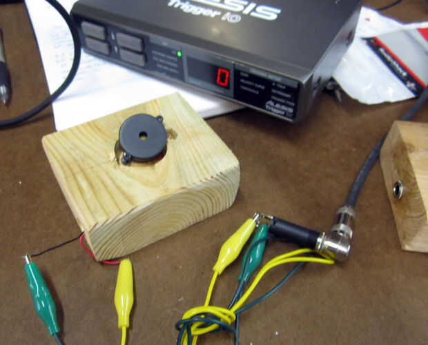 Este es un buen momento para poner a prueba su electrónica, antes de soldar o pegar cualquier cosa. Coloque pinzas de los cables rojo y negro del elemento piezoeléctrico a los dos terminales de la roseta de teléfono. Si entonces conecta un cable de guitarra de 1/4" cable en el jack y luego en el tambor de la máquina o interfaz, debe ver una respuesta al golpear el elemento piezoeléctrico o un bloque de madera. El punto de luz roja en mi Alesis drum trigger interfaz en las fotos anteriores indica que está recibiendo una señal. Esto debería funcionar con cualquier máquina del tambor o la interfaz que tiene cables de 1/4" desde desencadenadores.
