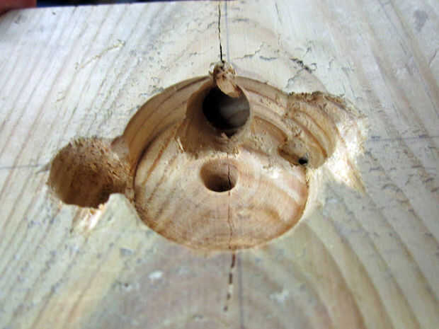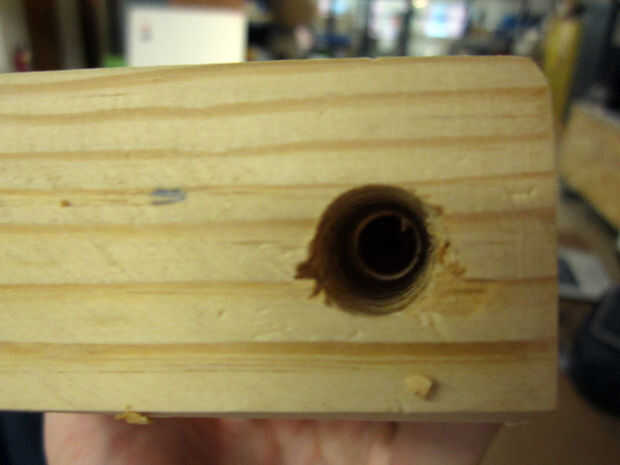 En primer lugar, medir el diámetro de la toma de teléfono. La utilicé fue 15/32". Una broca que hará un agujero está tan cerca de ese tamaño como sea posible y la atornille en el bloque de madera, justo detrás del agujero donde se sentará el disco piezoeléctrico. Conecte luego los dos agujeros atornillando por debajo donde se sentará el disco piezoeléctrico.