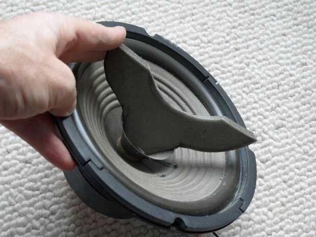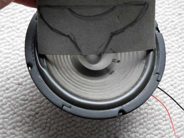 La malla entra en contacto con el cono del altavoz a través de algunos trozos de espuma. Usé un pedazo de estera que acampa. La parte que cubre el cono debe ser cortado para adaptarse a cualquiera que sea la forma de la es particular. La parte superior debe tocar la malla para una distancia razonable. Elegí la forma acampanada ves otras formas podría funcionar tan bien o incluso mejor.