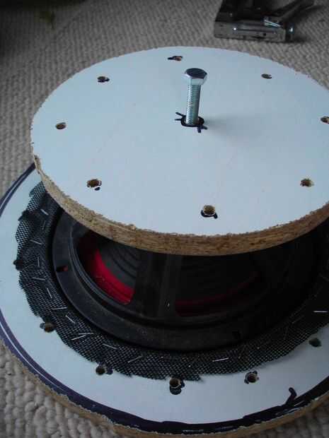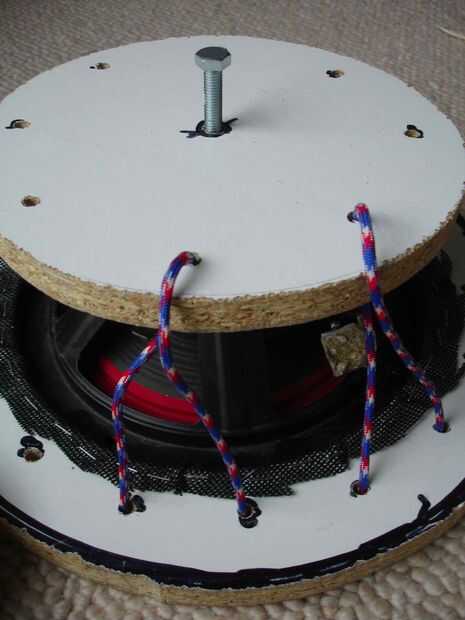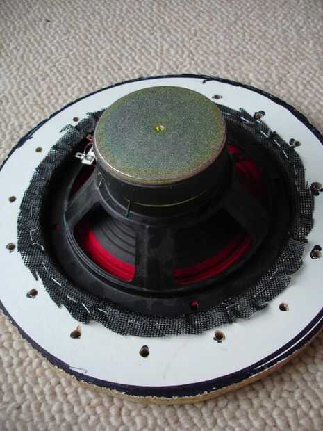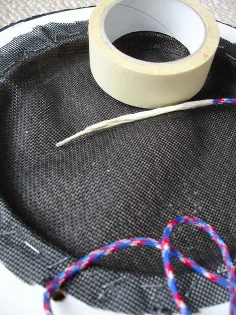 Porque una vez que esté bastante apretada y nudos apagado, el tensado final puede hacerse atornillando el perno contra el imán del altavoz. Otra vez, caliente la malla un poco a estirar a la forma.